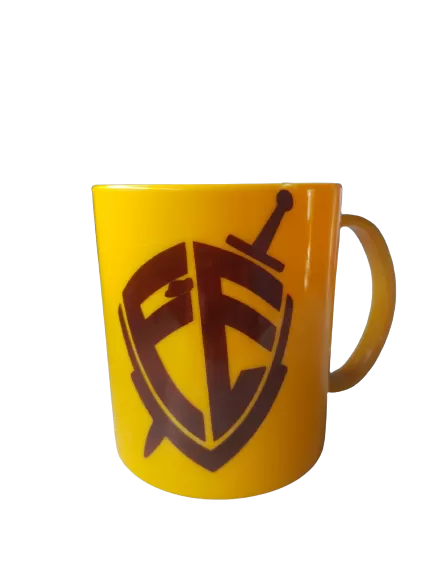 Caneca plástica com frases e imagens adesivada com adesivo resistente a água e lavagem.